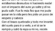 "No estábamos desnudos ni haciendo nada. Con el impacto del auto yo salté y él no pudo salir” aclaró la joven. Además, explicó que cuando lo fue a ver, acercándose a pesar de su brazo quebrado, se dio cuenta de que a él "si se le rompió y salió la ropa, a mí no, recién cuando llegue al hospital ellos mismos me cortaron la campera para sacármela”.