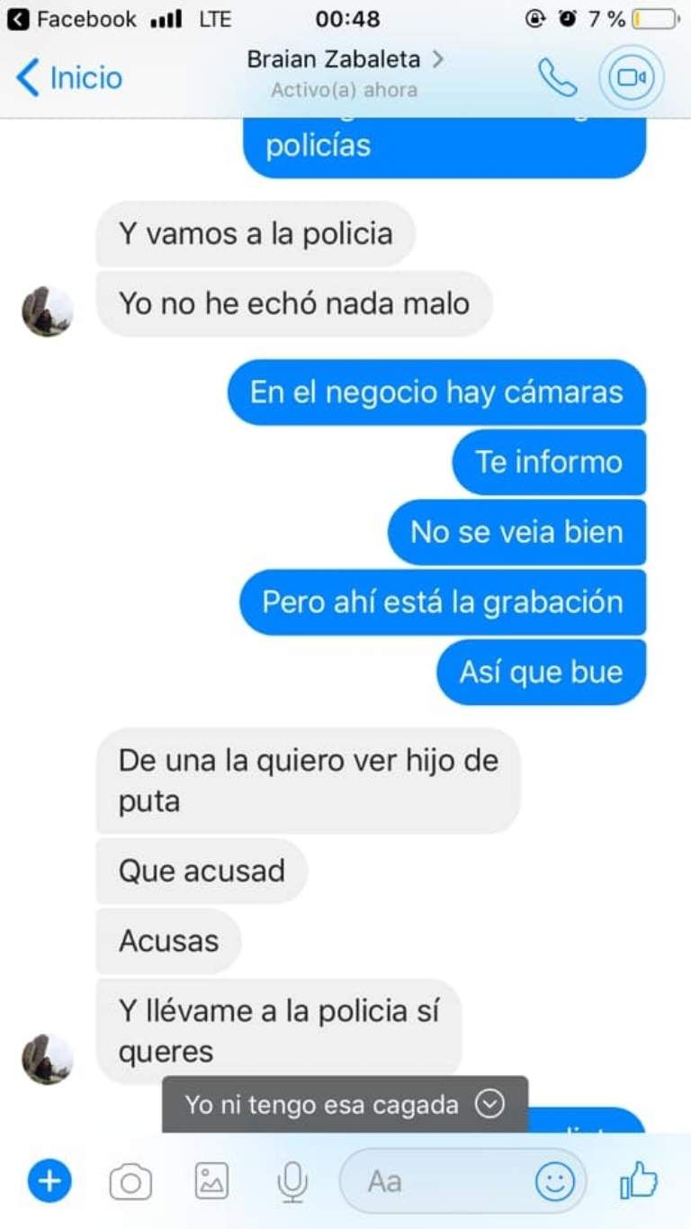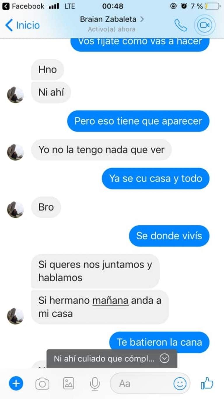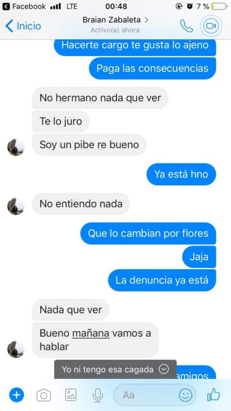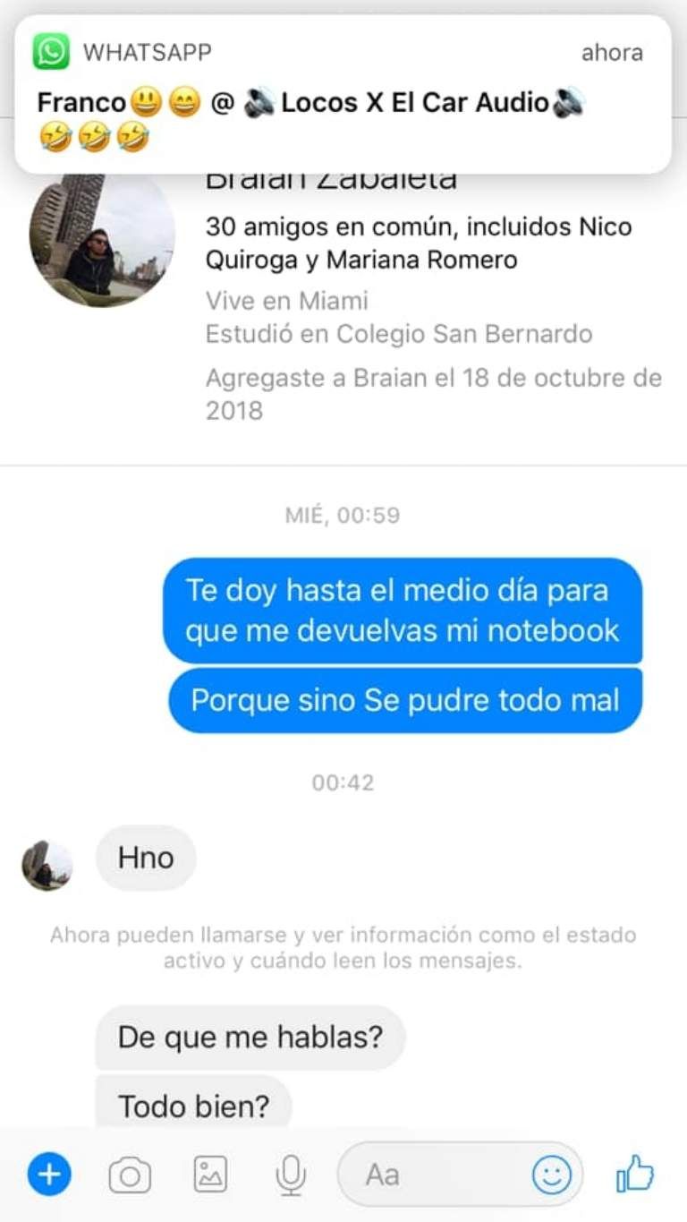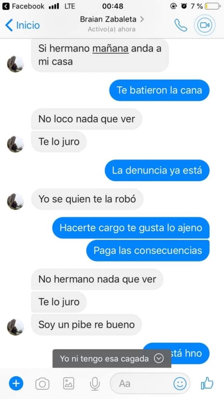 En una publicación que hizo en sus cuentas de Facebook e Instragram escrachó al presunto cómplice de quien se habría llevado la PC y también mostró el chat que habría mantenido con él. En la conversación se observa que, en una de las respuestas, el presunto cómplice, identificado como Braian Zabaleta, le confiesa quién se la robó.