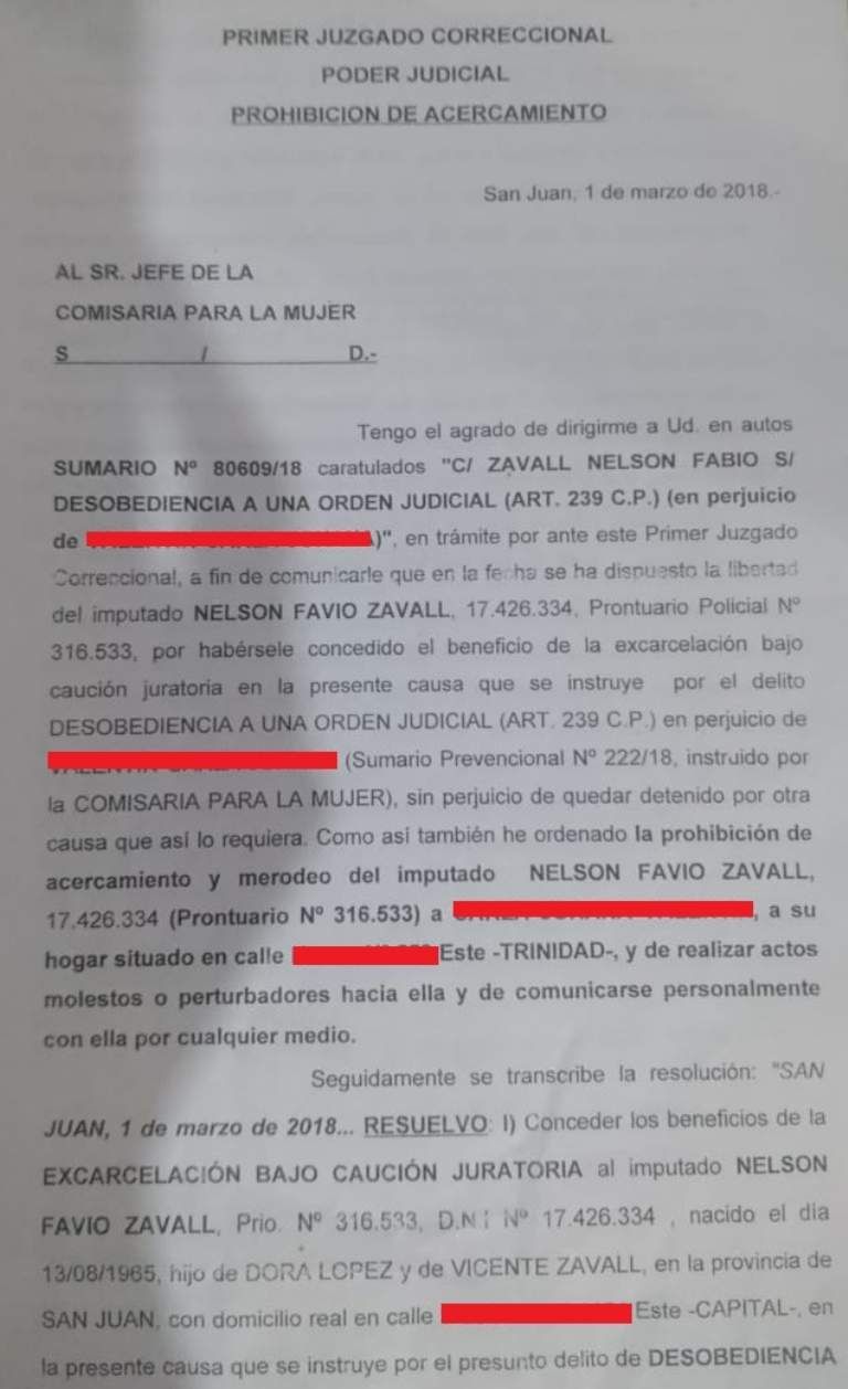 Ni botón de pánico para ella ni pulsera electrónica para él, lo único que consiguió de parte de la justicia fueron dos medidas perimetrales contra Zavall y que tampoco, según explica, nadie hace respetar. "Todos los días pasa por la puerta de mi casa en su auto, por lo general en la noche. Aveces, cuando salgo a comprar, está en la esquina. Me vigila", cuenta C.V. y sigue: "Hasta le paga a un vecino para que le diga si alguien viene a mi casa. Cuando no estoy, me llama infinitas veces, me deja mensajes, me escribe cartas".