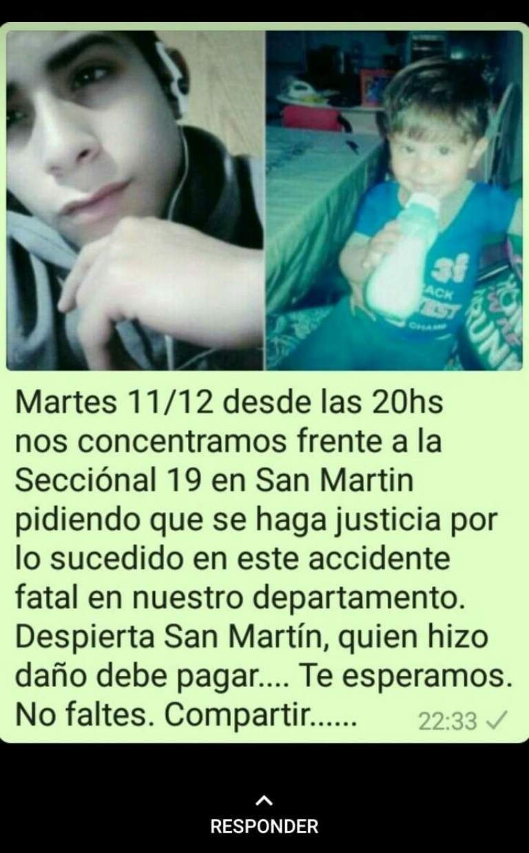 Jonathan Jofré, de 15 años, y de Tiziano Ibaceta, de 1 año y 11 meses murieron tras ser atropellados días atrás en el departamento San Martín. La familia y amigos se concentrarán, este martes, en la Seccional 19 donde se encuentra detenido Ricardo Castro, el hombre que provocó la tragedia.