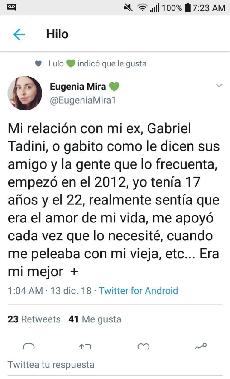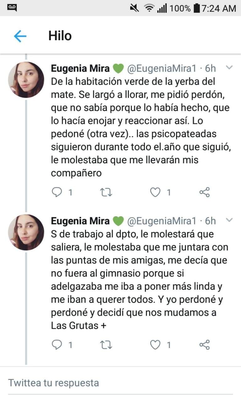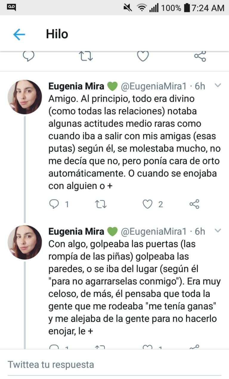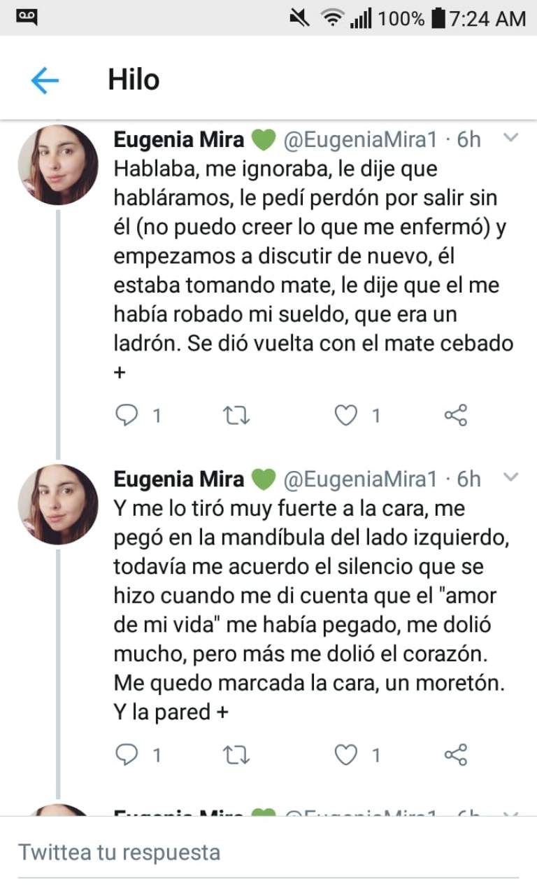 Una joven sanjuanina, Eugenia Mira (23), publicó en su cuenta de Twitter los terribles momentos de maltrato que le tocó sufrir por parte de su expareja, Gabriel Tadini. En un hilo de twitters contó las situaciones de violencia física y verbal a los que era sometida por el hombre.