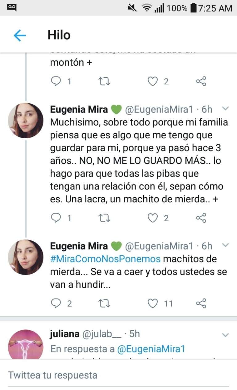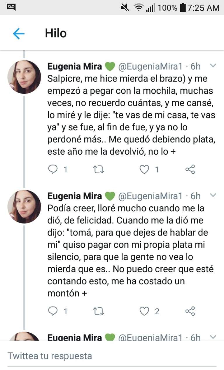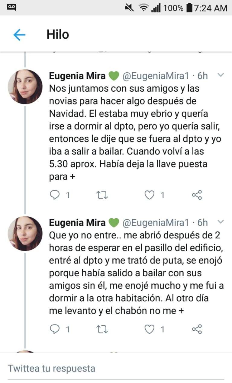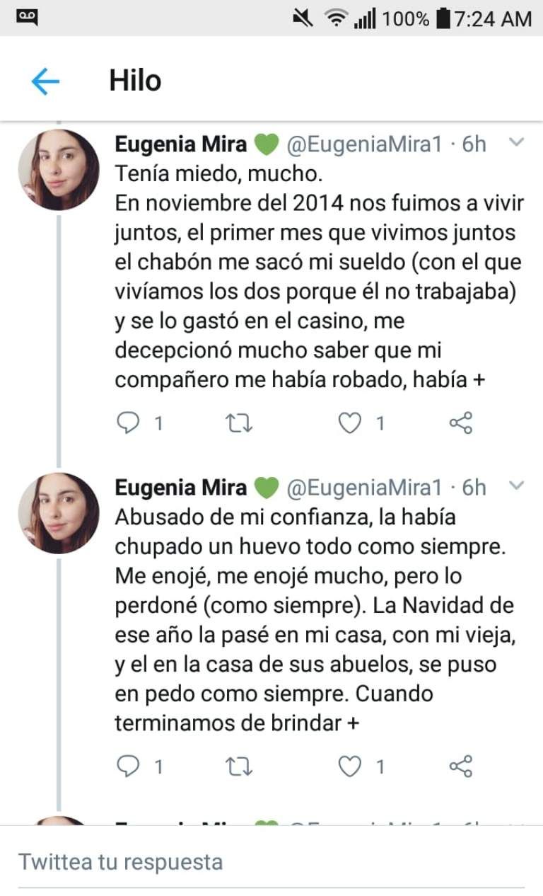Una joven sanjuanina, Eugenia Mira (23), publicó en su cuenta de Twitter los terribles momentos de maltrato que le tocó sufrir por parte de su expareja, Gabriel Tadini. En un hilo de twitters contó las situaciones de violencia física y verbal a los que era sometida por el hombre.