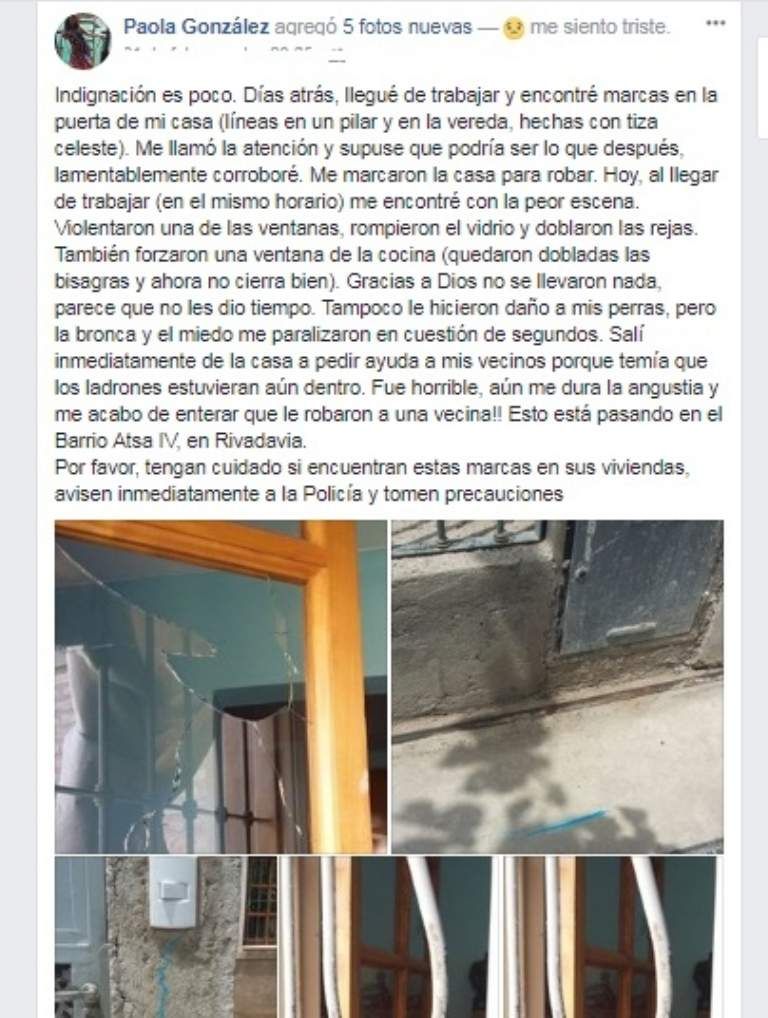 La periodista Paola González (diario El Zonda), se mostró indignada en las redes tras ser víctima de un intento de robo en su casa del barrio ATSA IV, en Rivadavia, que se hizo tristemente célebre esta semana con el marcado de casas con tiza azul por parte de los delincuentes, y donde se produjeron dos atracos.
