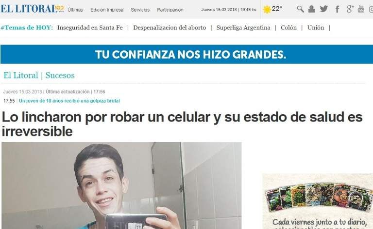 SUSCRIBITEEl caso del pibe linchado en Rawson llegó a la prensa nacional. MinutoUno e Infobae, entre otros medios, se hicieron eco de la golpiza que recibió el presunto ladron y que le provocó muerte cerebral.