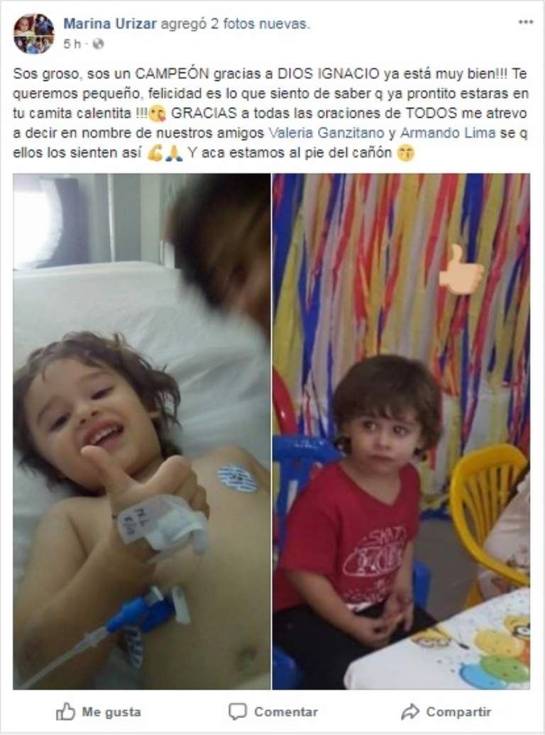 Por esa razón, su mamá, Marina Urizar, lo celebró en las redes sociales y agradeció a las personas que rezaron por su salud.
