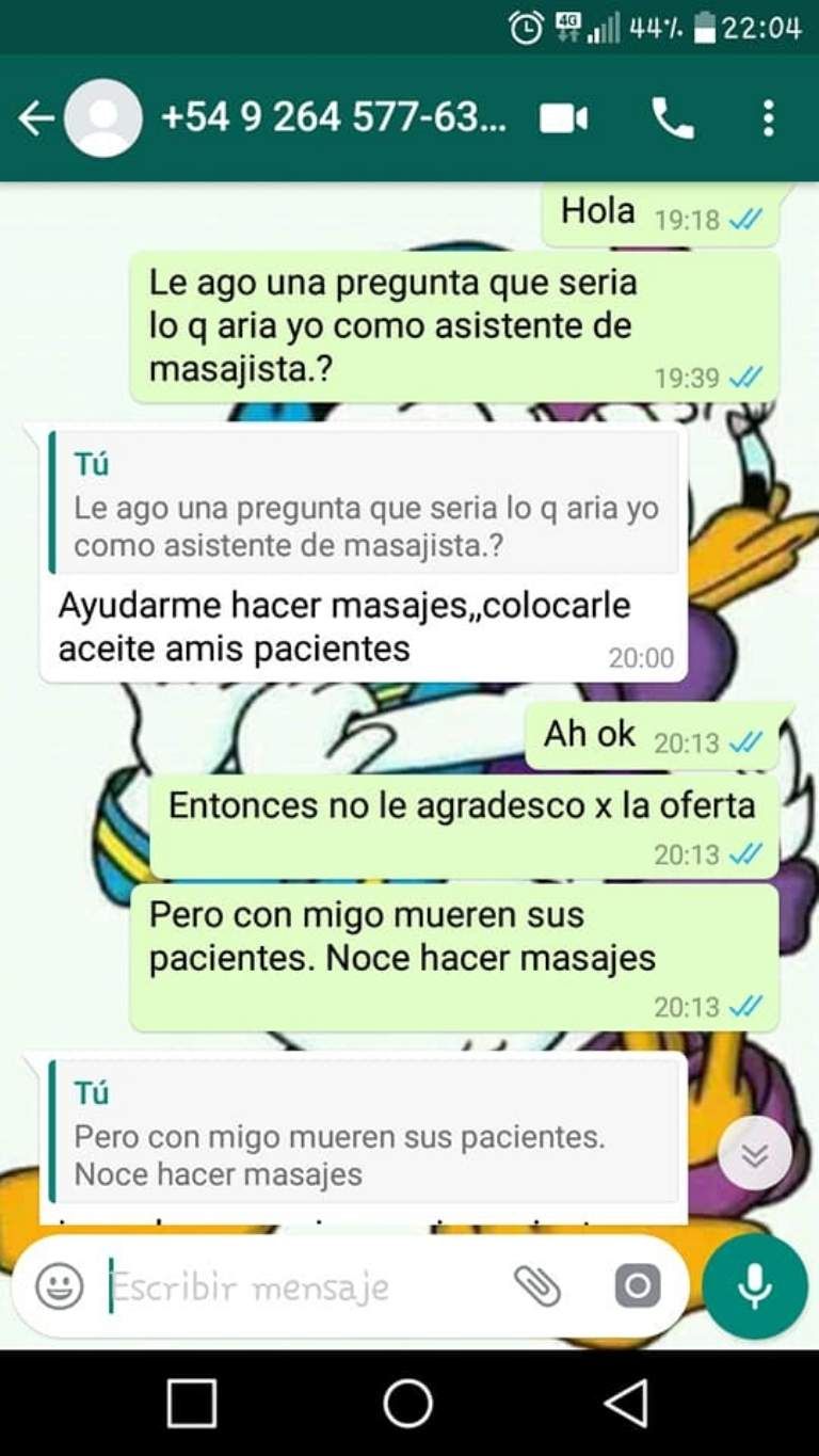 El hombre publicó un aviso pidiendo una asistente para un masajista. Cuándo las chicas lo contactaban y pedían detalles del trabajo, el sujeto se aprovechaba y les enviaba mensajes groseros. Mirá la conversación completa con una de las denunciantes y agendá el número para que no te pase lo mismo.