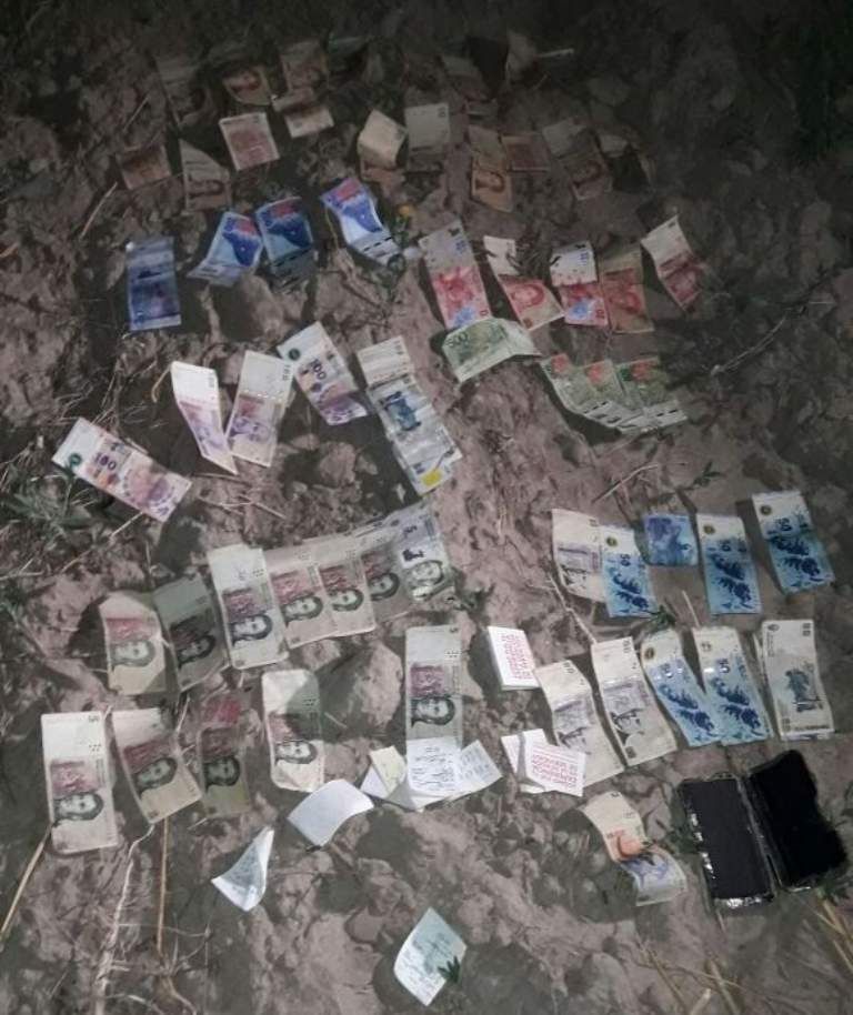 Fue allí cuando los policías se dan cuenta que su compañero antes entrevistado los había engañado. De inmediato se reanuda la búsqueda y se logra detener al policía, identificado como Raúl Emmanuel Benítez, en calles Gobernador Rojas y Rodríguez. A metros de ese lugar, en un descampado, encontraron el dinero.