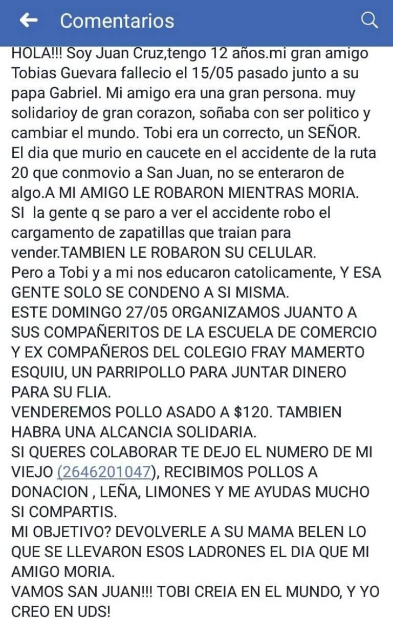 Según el mensaje, los incalificables delincuentes se llevaron cosas de los autos, y zapatillas y celulares de los fallecidos.