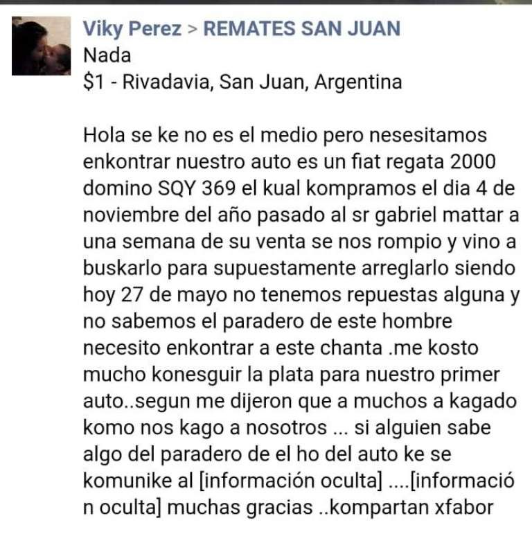 A través de su cuenta de Facebook, una sanjuanina denunció que a pocos días de haber comprado su primer auto se le rompió, lo devolvió para que se lo arreglen y nunca más lo encontró.