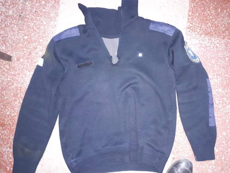 Ya detenido y en el asiento trasero, Tello comenzó empezó a golpearse contra la reja y las ventanas del patrullero, y además arrancó hasta romper la manija trasera derecha del móvil. El agente Sánchez constató que el detenido le había roto la tricota a la altura del cierre y descubrió además que habría sufrido golpes de puño en el rostro y una patada en la ingle.