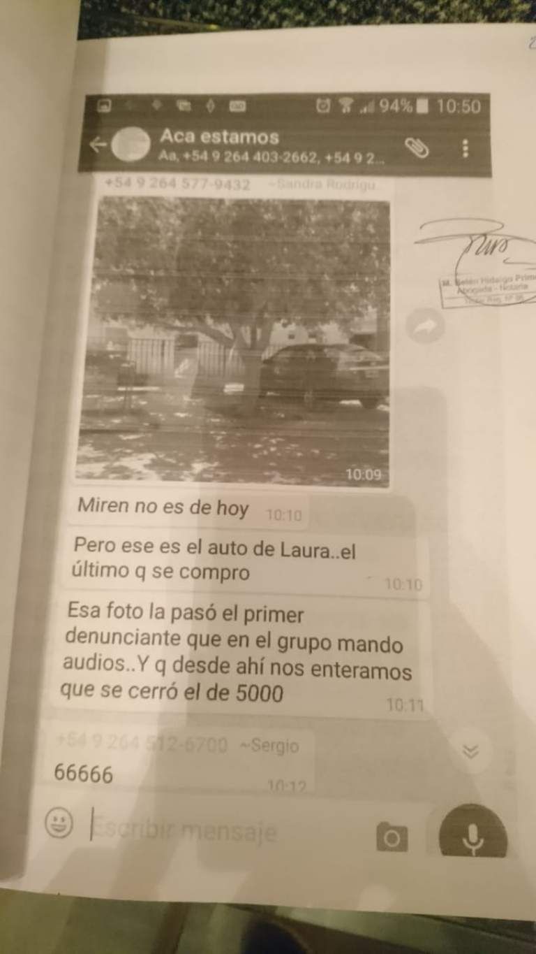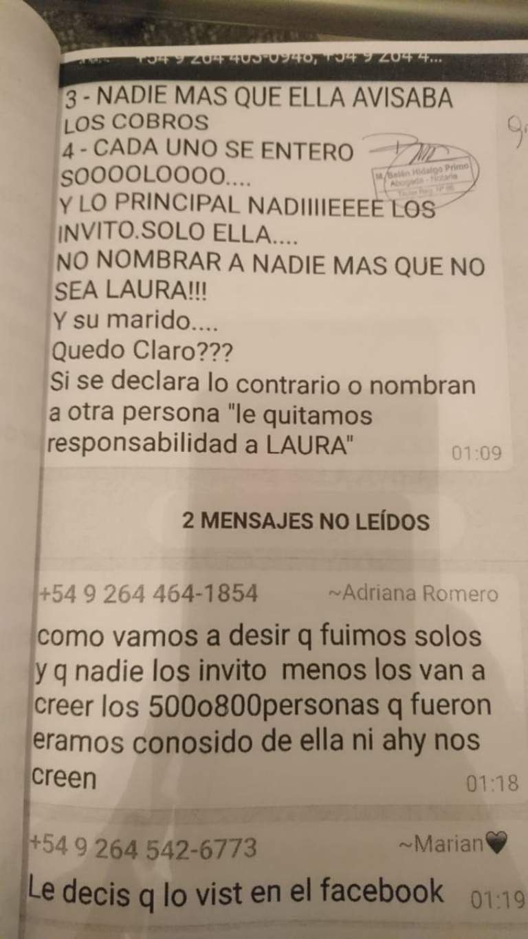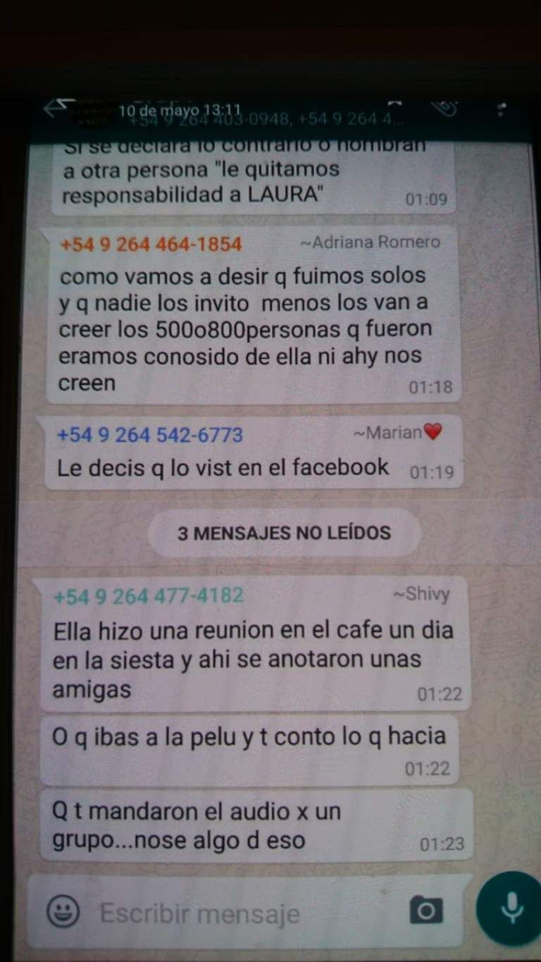 Tiempo de San Juan accedió a mensajes de un grupo de whats app -certificados por un escribano- en los que se puede apreciar de qué manera se organizaba antes de ir a declarar ante la justicia para comprometer a la denunciada que hoy permanece detenida en la Centra de Policía.