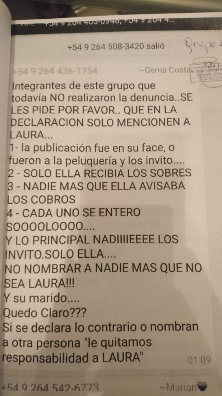 "Integrantes de este grupo que todavía no realizaron la denuncia, se les pide por favor que en la declaración sólo mencionen a Laura", reza uno de los mensajes y a continuación se detalla punto por punto los argumentos e información que se debe proporcionar en las denuncias.