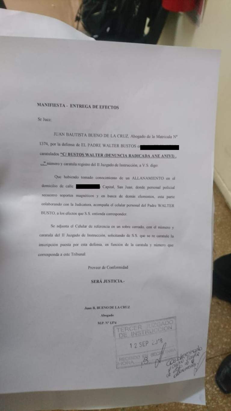 Por decisión del juez subrrogante en el Segundo Juzgado de Instrucción, Ricardo Grossi Graffigna, se llevó adelante el allanamiento en la casa de los padres del cura denunciado por abuso sexual, Walter Bustos, para secuestrar entre otras pertenencias el celular personal del sacerdote, sin embargo en el procedimiento no lo encontraron.