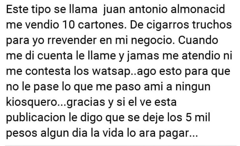Un lector de Tiempo de San Juan se mostró muy molesto con un sujeto que dice que le vendió “cigarrillos truchos” y que al momento que él le pidió que le devuelva el dinero, este no se apareció nunca más.