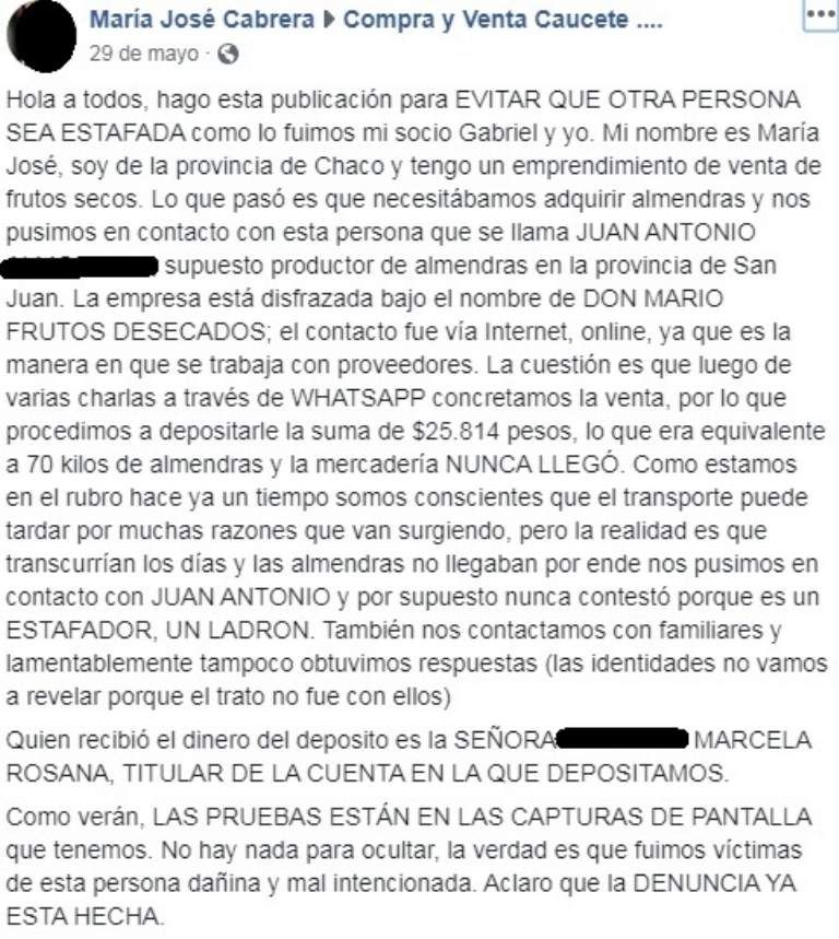 Lo más increíble de este hecho, es que también una ciudadana de Chaco escrachó en las redes a este mismo sujeto y dijo que el hombre se hizo pasar por el dueño de una empresa llamada “Don Mario Frutos Desecados” y que compró un total de 20.000 pesos en frutos secos, pero que la mercadería nunca le llego a su provincia.