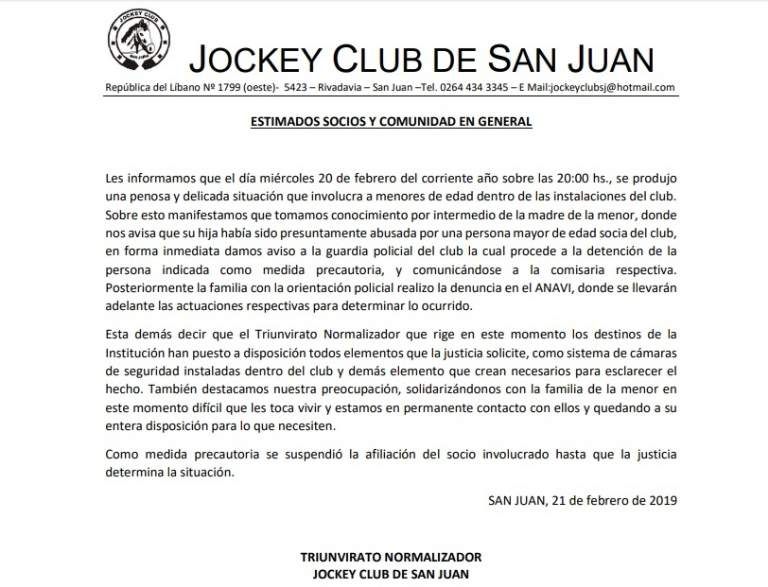 Tras el revuelo que se dio este jueves cuando salió a luz, la denuncia que hizo una madre acusando a un socio del Jockey Club, que había abusado a su hija, el club rompió el silencio y a través de un comunicado dio a conocer el apoyo con la familia y además lo dolido que están por el episodio que ocurrió.