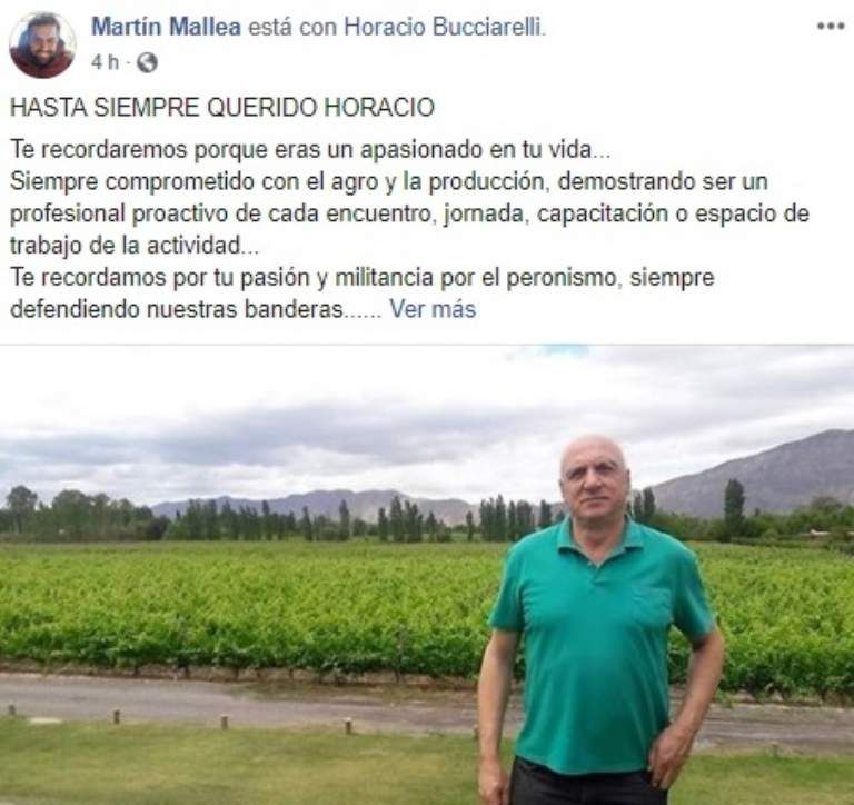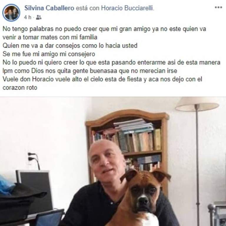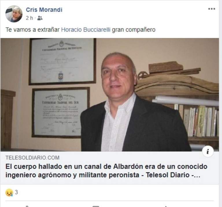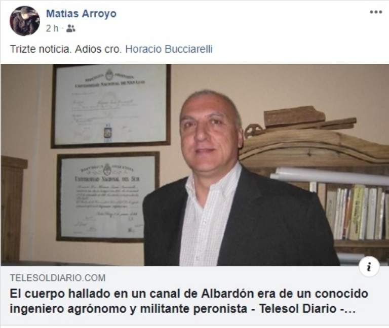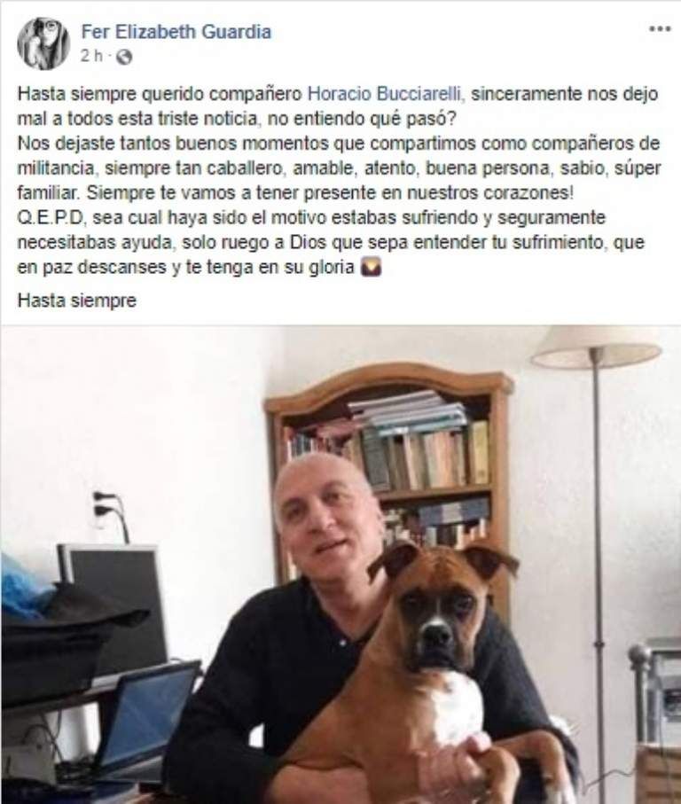 La pérdida del ingeniero Horacio Bucciarelli cayó cómo un baldazo de agua fría en sus amigos y familiares, quienes lamentaron su deceso y lo despidieron a través de facebook. El hombre tenía 69 años y militaba en la agrupación Santa Filomena en Desamparados. Dicho espacio tiene raíces peronistas.