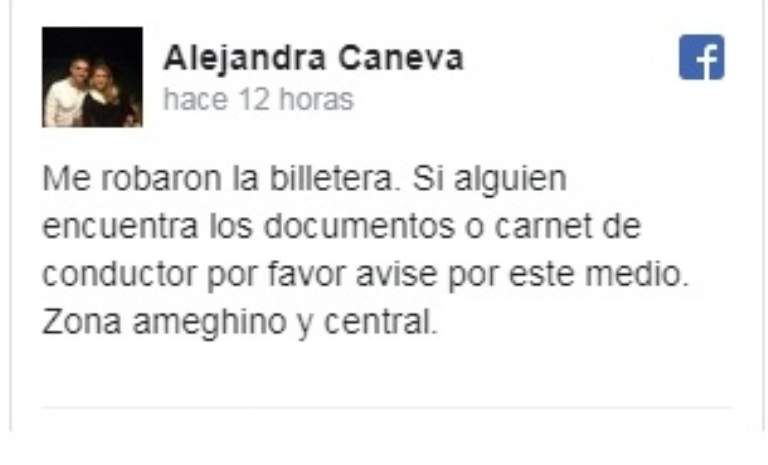 La inseguridad no perdona a nadie. Este lunes le sustrajeron la billetera a la esposa del intendente de la Capital Franco Aranda. Se trata de la secretaria legislativa del consejo deliberante de mencionado municipio Alejandra Caneva. La funcionaria publicó en su cuenta de Facebook que este lunes le sustrajeron la billetera con documentos y carnet de conductor en la intersección de Avenida Ignacio de la Roza y calle Ameguino. 'Si alguien sabe algo, por favor, avise', escribió la pareja del intendente.