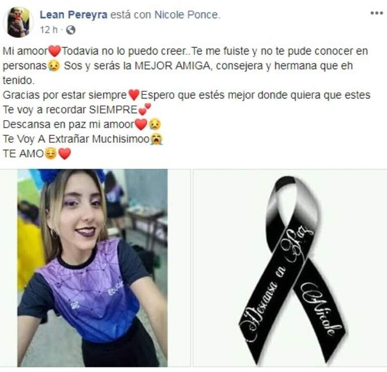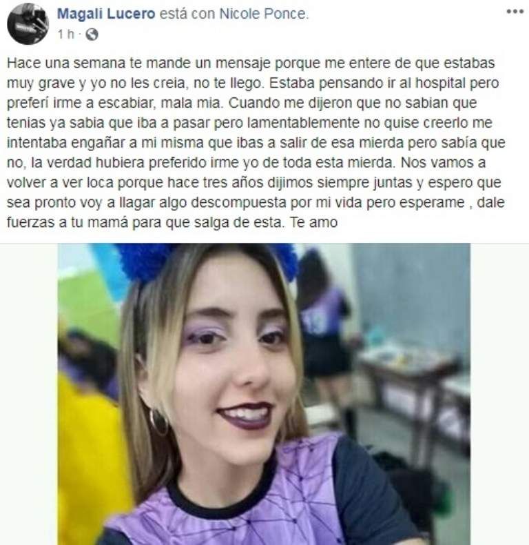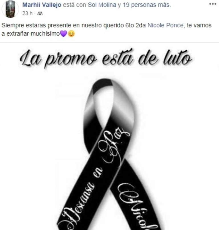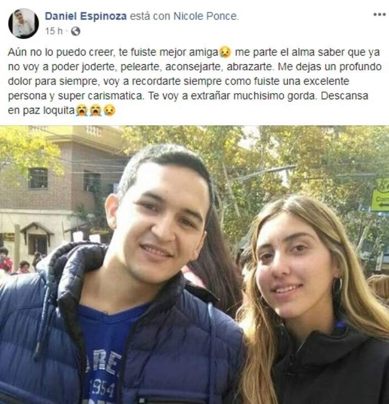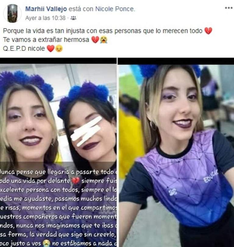 Este último martes, Nicole Ponce falleció por una enfermedad poco común, el síndrome de Stevens Johnson, en el Hospital Marcial Quiroga. Su repentina muerte causó tristeza en todo su entorno y muchos allegados dieron a conocer sus mensajes de condolencias por la red social Facebook.