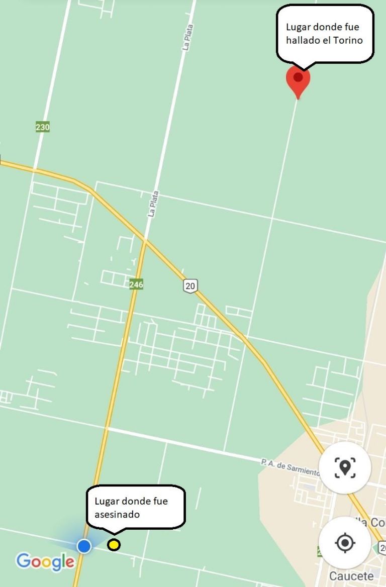 Su vehículo fue hallado abandonado y prendiéndose fuego, pasada la 1 de la madrugada, en inmediaciones de Enfermera Medina y Rio Negro. Distancia que está a casi 8 kilómetros de donde Brizuela fue asesinado, precisamente 7.7km. Mirá el mapa: