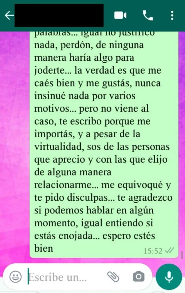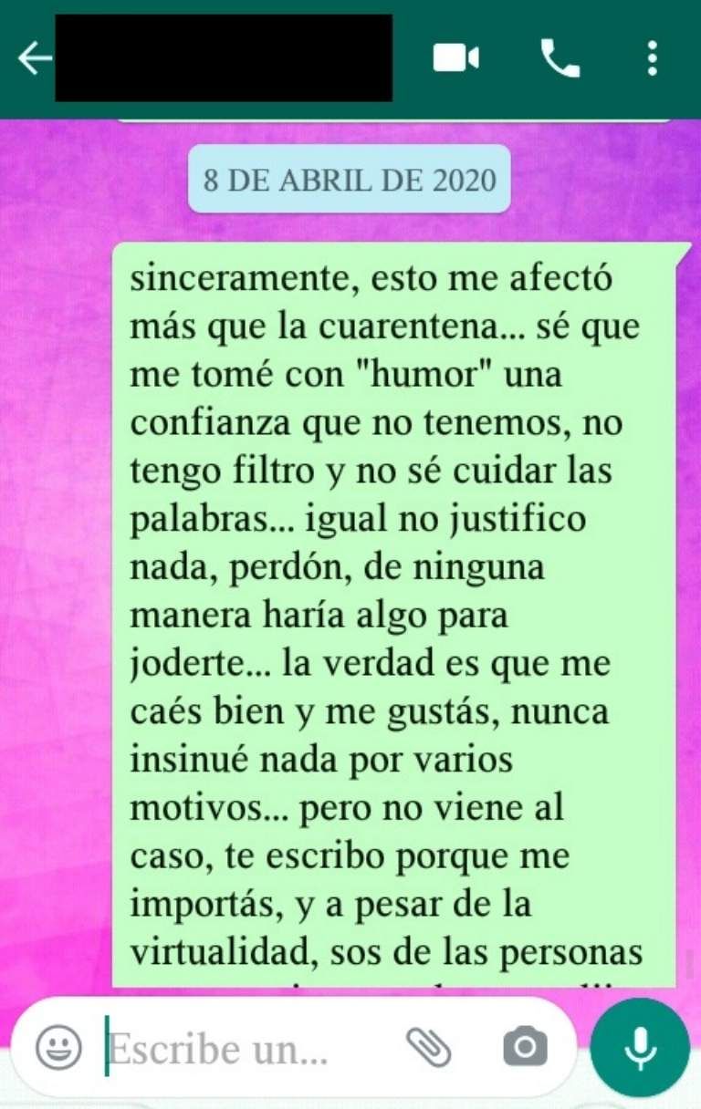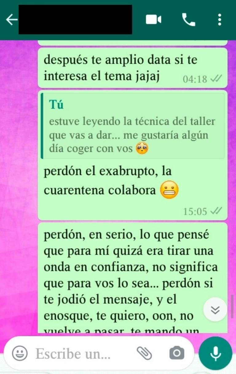 En el comunicado de las actrices sanjuaninas, afirmaron que el sujeto no solo habría acosado físicamente, sino también virtualmente con varios mensajes que él mismo difundió en el ambiente artístico para justificarse. Pero la respuesta que recibió no fue la esperada, porque en el contenido de las charlas que mantuvo con una de las mujeres sólo sumó más leña al fuego.