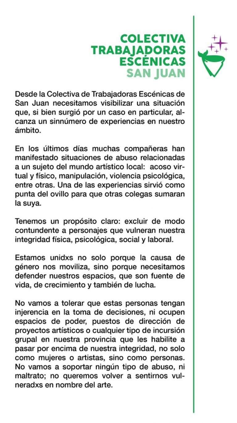 “Tenemos el propósito de excluir de modo contundente a personajes que vulneran nuestra identidad física, psicológica, social y laboral”, dice el comunicado de las actrices locales que atestiguan haber llevado el asunto ante la Justicia. La denuncia quedó radicada en Comisaria de la Mujer por la víctima y fue acompañada por el colectivo Ni Una Menos de San Juan.