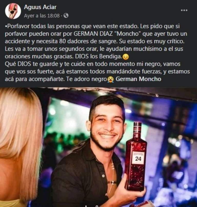La salud de Germán Moncho Díaz de 21 años, el reconocido RRPP de la noche sanjuanina y muy querido por los jóvenes, ha presentado mejorías, pero sigue internado en grave estado en el Hospital Rawson.
