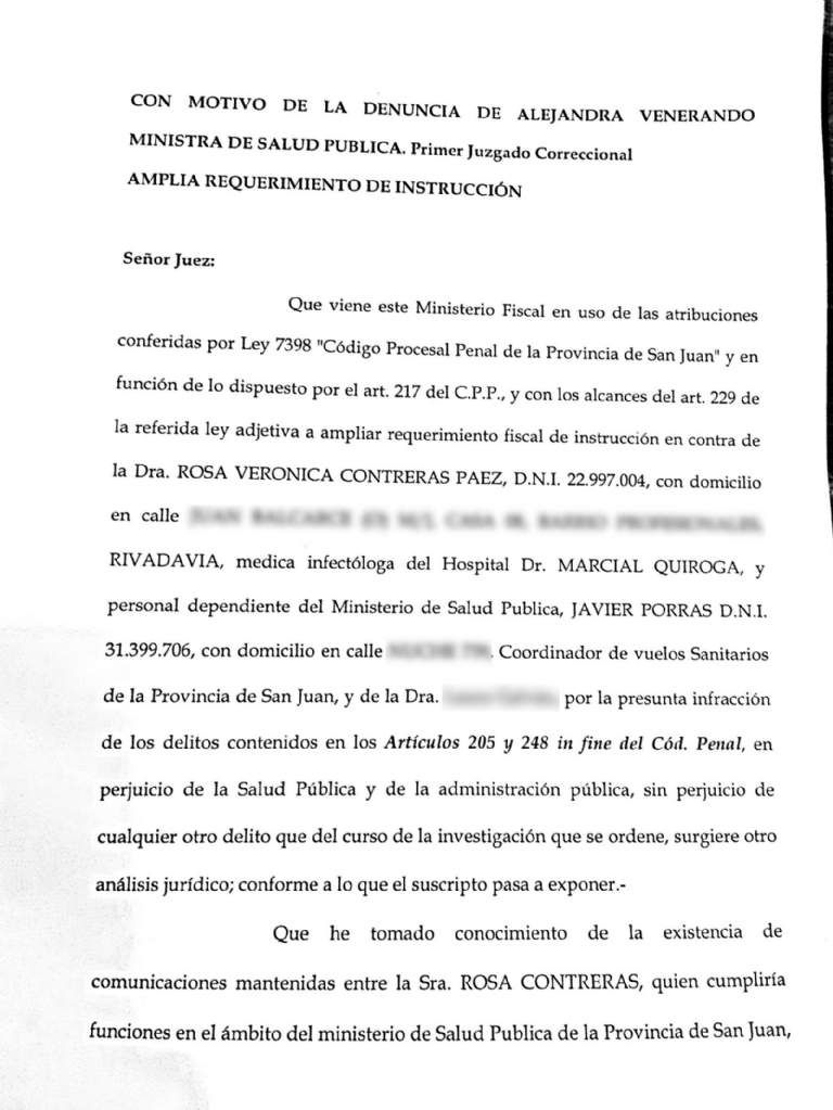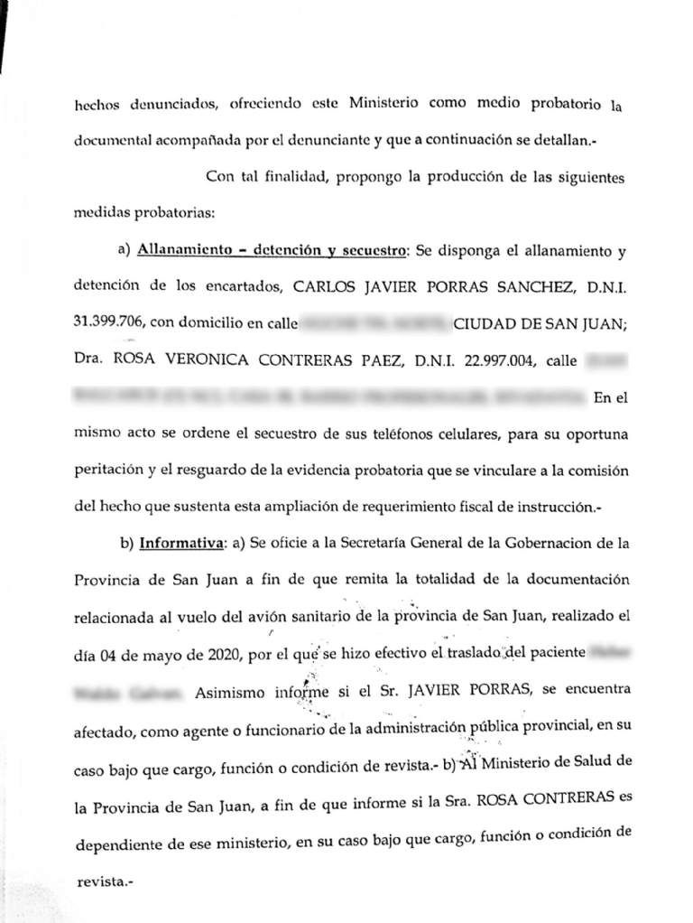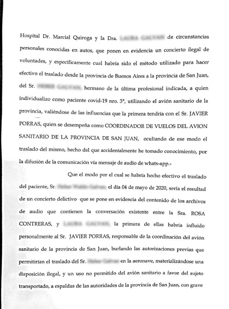 Según trascendió, el Ministerio Público recibió, de manera anónima, una serie de audios en los que la médica infectada le pedía a Contreras (infectóloga del Hospital Marcial Quiroga) que convenza a Porras (coordinador de vuelos sanitarios) de meter en el vuelo sanitario al hermano de la profesional, quien terminó convirtiéndose en el tercer caso con COVID-19 en San Juan y de quien se habría terminado contagiando la médica. Todo esto a espaldas de las máximas autoridades.