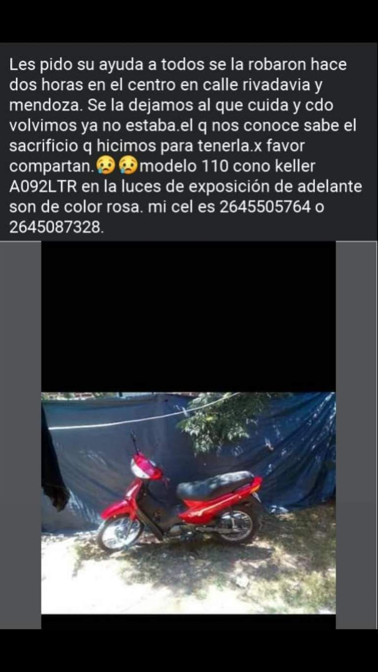 Ahora Daniela y su familia solicitaron ayuda a los sanjuaninos, compartieron una foto del vehículo y pidieron que si cualquiera la ve se ponga en contacto con ella. "Hace tres meses la terminamos de pagar, nos costó mucho poder comprarla y nos hace mucha falta" aseguró entre lágrimas.