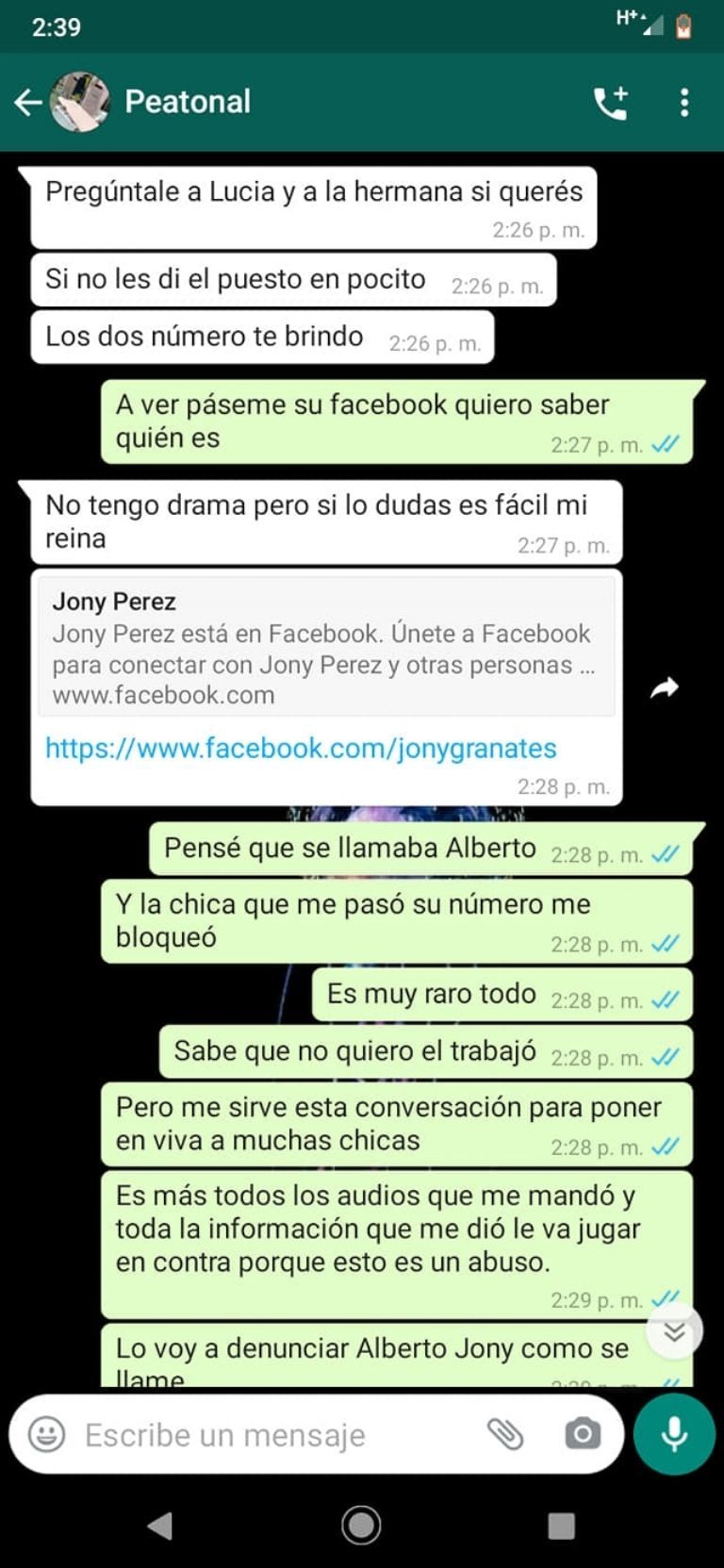 Acto seguido, "Albert", le ofreció pasarle el número de dos hermanas a las que les habría dado trabajo a cambio de un encuentro sexual, para que ella misma corroborara que si se acostaba con él iba a conseguir trabajo.
