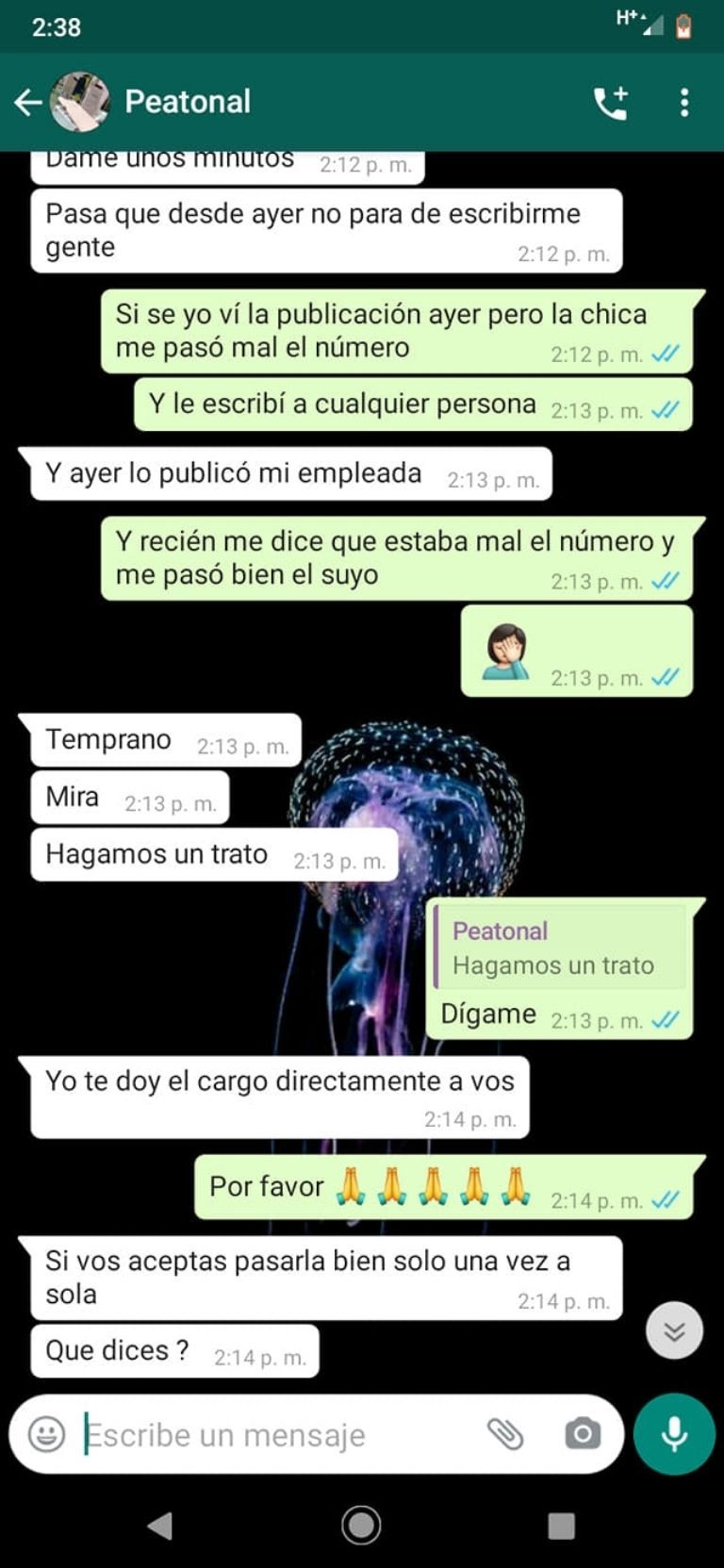 La mujer accedió, pasó sus datos y ahí fue cuando el sujeto la atacó. "Dame unos minutos, pasa que desde ayer no para de escribirme gente. Mirá hagamos un trato, yo te doy el cargo directamente a vos si aceptás pasarla bien solo una vez a solas", fue la respuesta que recibió.