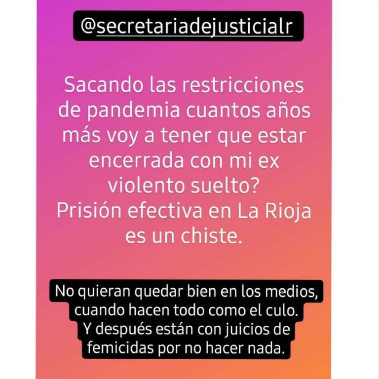 La queja de Paula fue dirigida a @secretariadejusticialr: “Sacando las restricciones de pandemia, ¿cuántos años más voy a tener que estar encerrada con mi ex violento suelto? prisión efectiva en La Rioja es un chiste. No quieran quedar bien en los medios, cuando hacen todo como el culo y después están con juicios de femicidas por no hacer nada”, sentenció la joven en su cuenta de Instagram que a los pocos minutos fue inhabilitada.