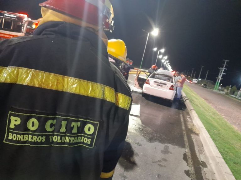 Bomberos Voluntarios de Pocito debieron trabajar en los primeros minutos del sábado para sofocar el incendió que se generó en un auto, en plena calle.