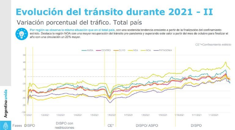 La elaboración de los datos tiene en cuenta las disposiciones de circulación por el COVID, lo que determinó que haya más o menos movilidad de la población en diferentes lapsos a lo largo del año, es decir, que fue una medición atípica. En toda Argentina, el 2021 comenzó con -30% de tráfico de autos particulares y transporte público. A partir de abril se percibe mayor caída en el tránsito particular que en el público, con un marcado descenso a partir del confinamiento estricto de fines de mayo. Desde octubre 2021, se advierte una sostenida tendencia creciente llegando, tanto el transporte público como los autos particulares a los valores pre-pandemia. Para los vehículos particulares se observan 2 picos: Semana Santa y el fin de semana largo de octubre.