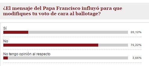 Luego Tiempo de San Juan realizó una nueva encuesta preguntando si "el mensaje del Papa Francisco influyó para que modifiques tu voto de cara al ballotage" y el 20,06% de los lectores respondió que sí, en tanto que el 76,29% manifestó que no.