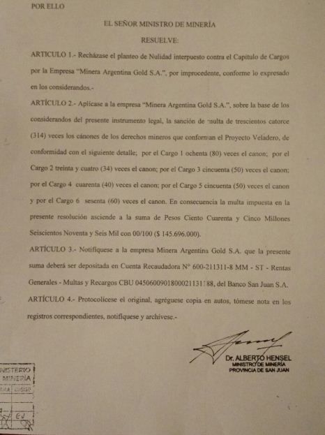 Y finalmente dijo que "después de seis meses de anunciar el sumario administrativo" el ministerio de Minería resolvió aplicar una multa de 145.696.000 de pesos a la empresa "Minera Argentina Gold S.A.", subsidiaria de Barrick Gold en Argentina.