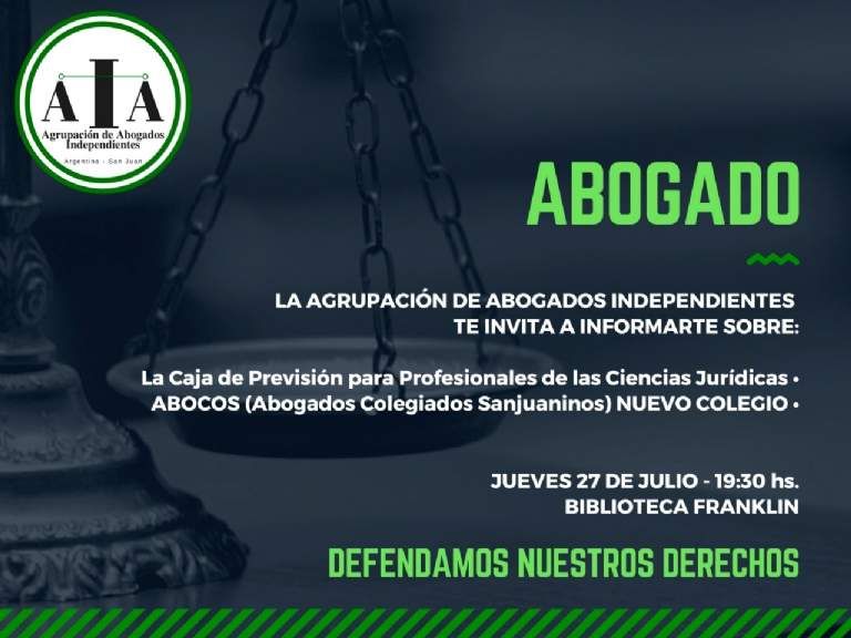 A partir de la tarde del jueves, los abogados sanjuaninos tendrán una tercera entidad que los represente. Se trata de ABOCOS (Abogados Colegiados Sanjuaninos), el cual nace como una alternativa al Colegio de Abogados. Así, ambas instituciones se suman al Foro de Abogados, la institución que sigue siendo la de más peso porque es la que maneja la matrícula que obligatoriamente los abogados necesitan para poder litigar.