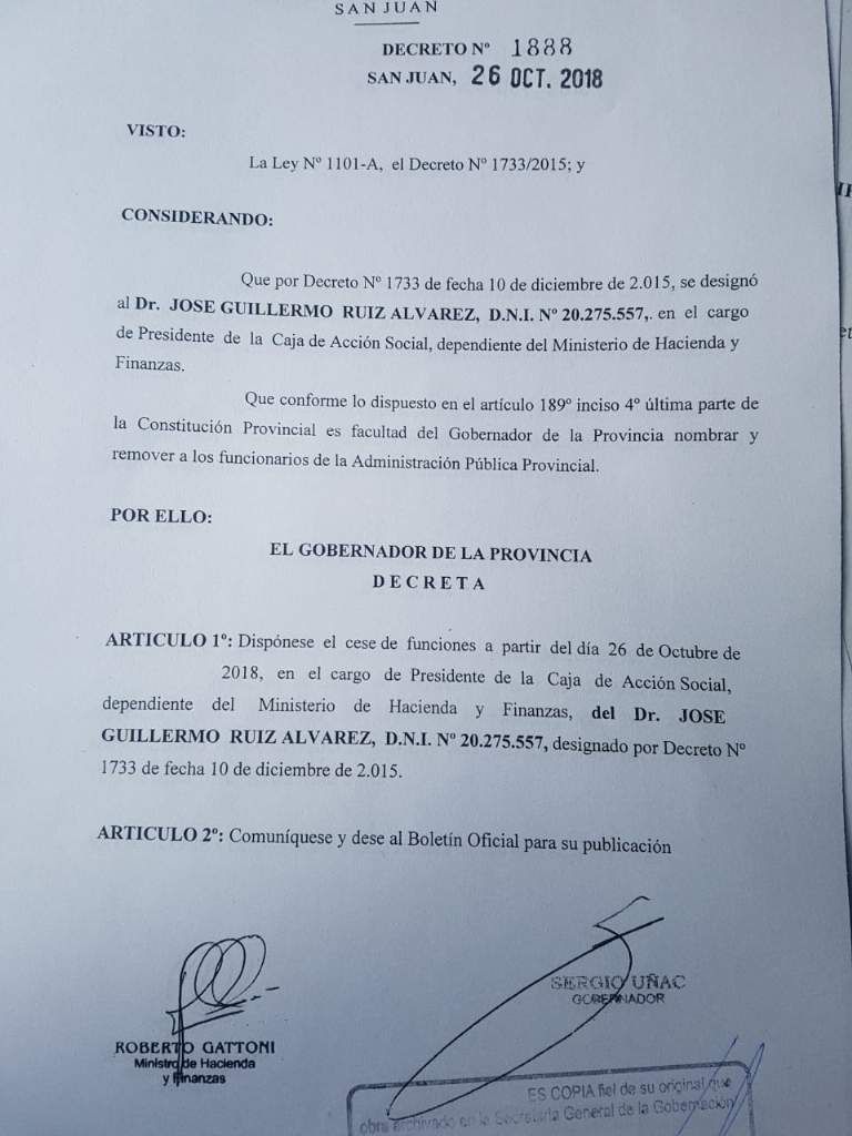 “Me enteré de la investigación, es una denuncia que esta entablada en el Ministerio de Seguridad de la Nación, en la Secretaria de Articulación Judicial. Lo que hicimos hoy es separarlo del cargo como medida preventiva. No estamos prejuzgando, estamos diciendo que hay una denuncia que no es anónima, es con nombre apellido y hay una filmación. El fiscal definirá la indagatoria y se abre un proceso judicial. No obstante, preventivamente lo hemos separado del cargo a Guillermo Ruiz Alvarez”, dijo Uñac.