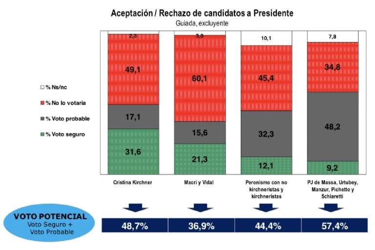 De acuerdo al sondeo, el peronismo no K tiene fuerte potencialidad de crecimiento, ya que prácticamente carece, de rechazo, aunque es el que tiene menos voto seguro.