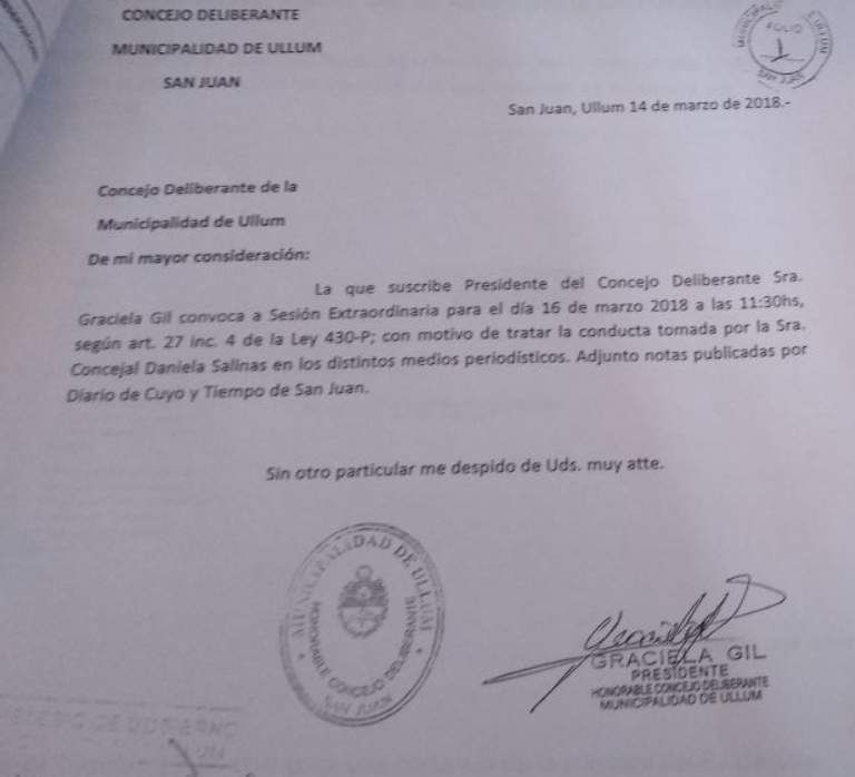 El municipio de Ullum está que arde. Tras el pedido de investigación que presentó la concejal del PJ Daniela Salinas el 6 de marzo último en el Tribunal de Cuentas, respecto de compras hechas por el intendente Leopoldo Soler al matrimonio de Claudio Gastón Rey y Susana Nale, el Concejo Deliberante convocó a una sesión para tratar la conducta de la edil denunciante.