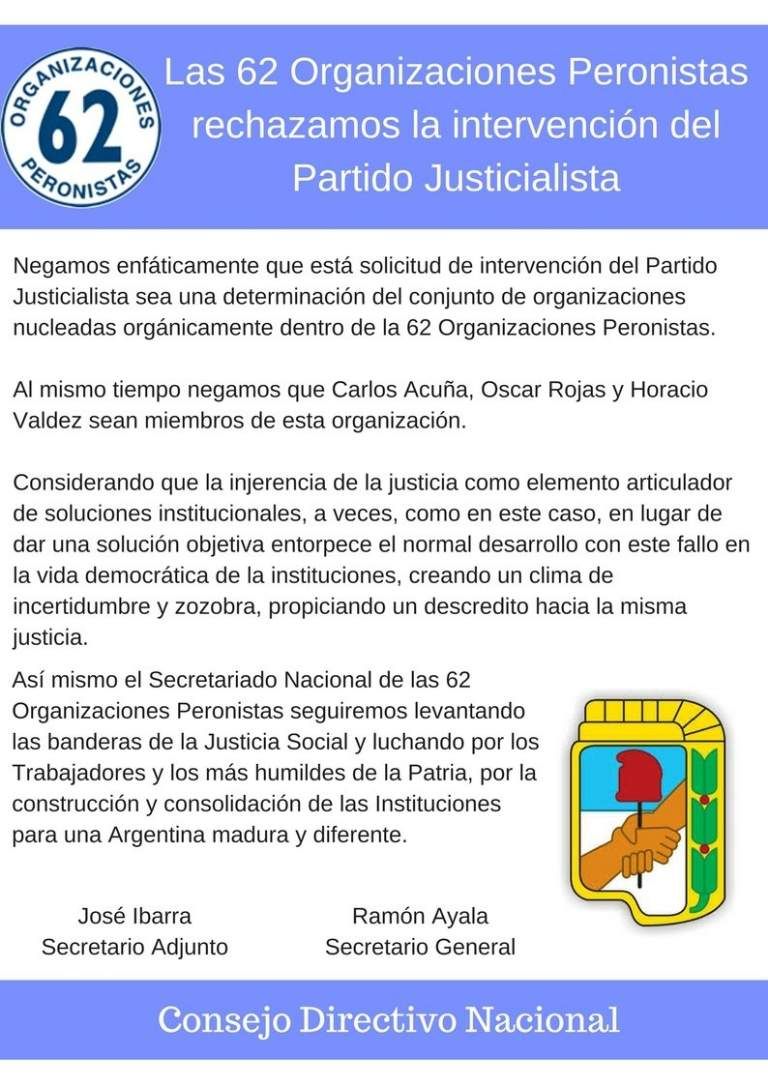 Con la firma de su secretario General Ramón Ayala y de su secretario Adjunto José Ibarra, las 62 Organizaciones Peronistas negaron haber incidido en el pedido de intervención al PJ Nacional, que dispuso la jueza Servini, colocando como interventor a Luis Barrionuevo.
