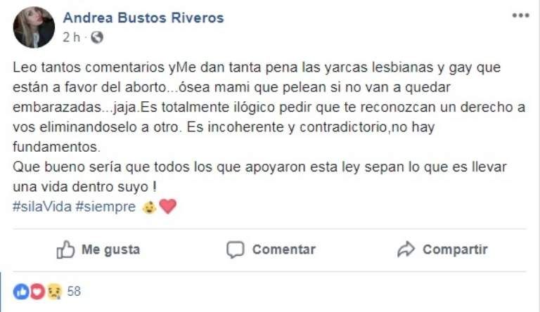 La media sanción de la Cámara de Diputados respecto a la interrupción voluntaria de un embarazo generó todo tipo de opiniones en las redes sociales. Justamente quien se manifestó al respecto fue la angaquera Andrea Bustos Riveros, quien fue Virreina Nacional del Sol en 2013,