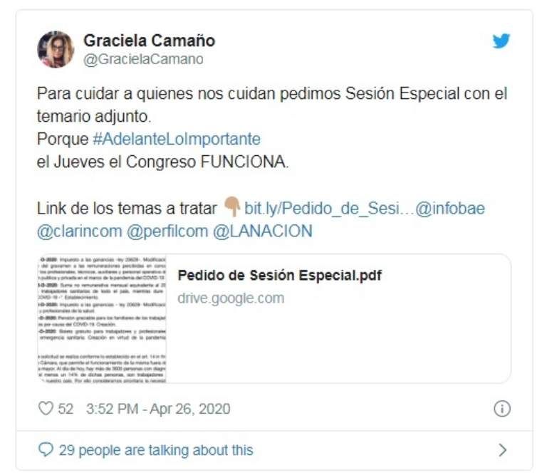 "El Congreso debe ejercer urgente su rol de acompañamiento y control en esta etapa difícil del país. Tenemos que legislar medidas de protección y alivio económico-fiscal para personal de salud y fuerzas de seguridad involucrados en la pandemia", lanzó García de Luca desde su cuenta de Twitter.