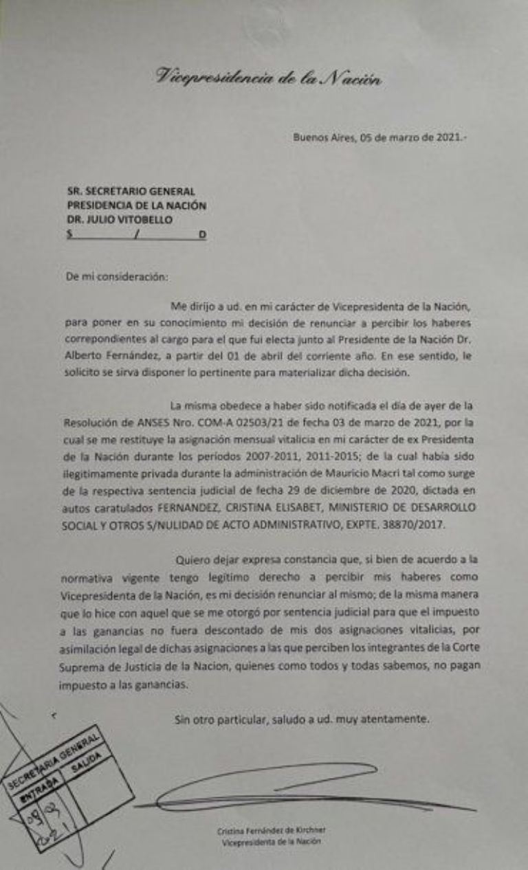 Según el escrito la decisión “obedece a haber sido notificada el día de ayer -la carta está fechada el 5 de marzo- de la Resolución de ANSES Nro. COM-A 02503/21 de fecha 03 de marzo de 2021, por la cual se me restituye la asignación mensual vitalicia en mi carácter de ex Presidenta de la Nación durante los periodos 2007-2011, 2011-2015, de la cual había sido ilegítimamente privada durante la administración de Mauricio Macri”.