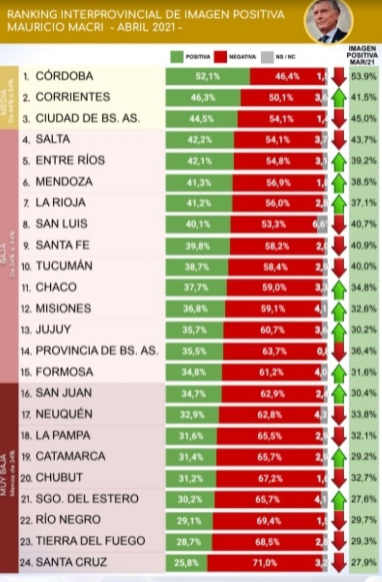 El ex presidente Mauricio Macri tiene aún peor consideración entre los sanjuaninos: su imagen negativa es del 62.9, mientras que la positiva cayó 4.3 desde marzo, ubicándose en el 34.7.