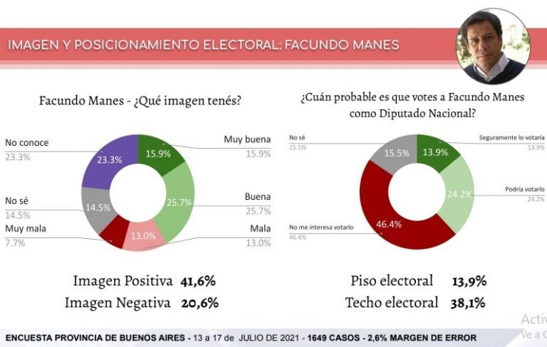 El estudio mide además piso y techo electoral. Cómo mínimo, hoy Facundo Manes estaría sacando el 18% de los votos, pero sus chances electorales pueden subir hasta el 38%.