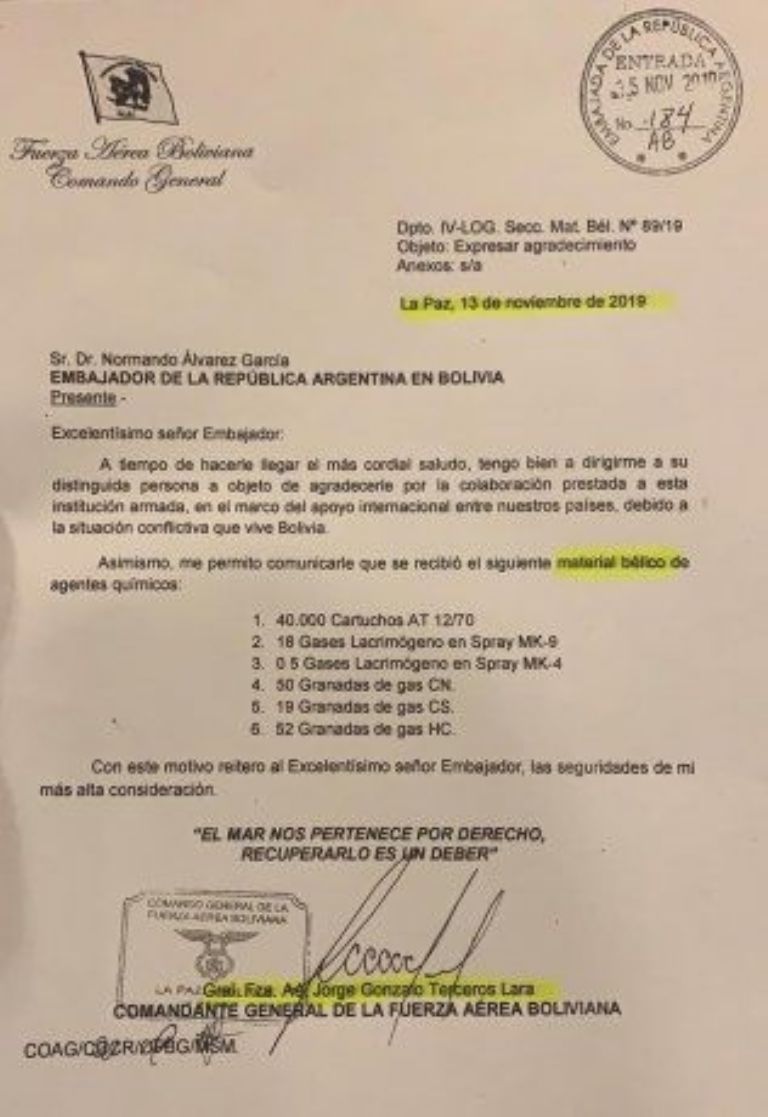 La carta está fechada el 13 de noviembre de 2019. Dos días después el pueblo boliviano sufría la masacre de Sacaba, y 6 días después la de Senkata.