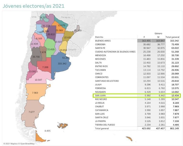 Por la ley de voto joven, los adolescentes a partir de los 16 años pueden elegir las autoridades nacionales que gobiernan el país. Este año hay elecciones nacionales en toda Argentina, el 12 de septiembre las PASO y el 14 de noviembre las legislativas. Y en San Juan son 12.434 los jóvenes de 16 y 17 años habilitados a votar por primera vez. De ellos, 5.992 son mujeres y 6.442 son varones. San Juan se ubica en el puesto 16to. en el ranking de voto joven por provincias, según los datos de la Cámara Nacional Electoral. Por otro lado, suman 861.149 los jóvenes que votan por primera vez en todo el país.