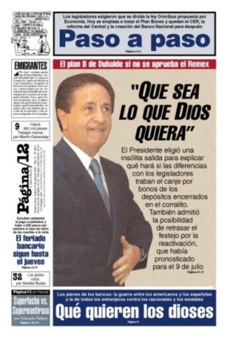 Hoy el jefe de Gabinete Juan Manzur dejó una frase que medios y dirigentes opositores remitieron directamente a una del ex presidente Duhalde, cuando abrió el 23 de abril de 2002, tras un feriado bancario y en medio de una crisis fenomenal, dijo que “los bancos igual abrirán, y que sea lo que Dios quiera”.