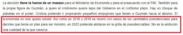 Un medio porteño, en uno de sus artículos de análisis político del domingo, publicó la frase, en referencia al ministro: “Así como en 2018 y 2019 se reunió con varios de los candidatos presidenciales para decirles que tenía un plan para ser ministro, en 2023 pretende alistarse en la grilla de presidenciables. No es la ambición una cualidad de la que carezca”.